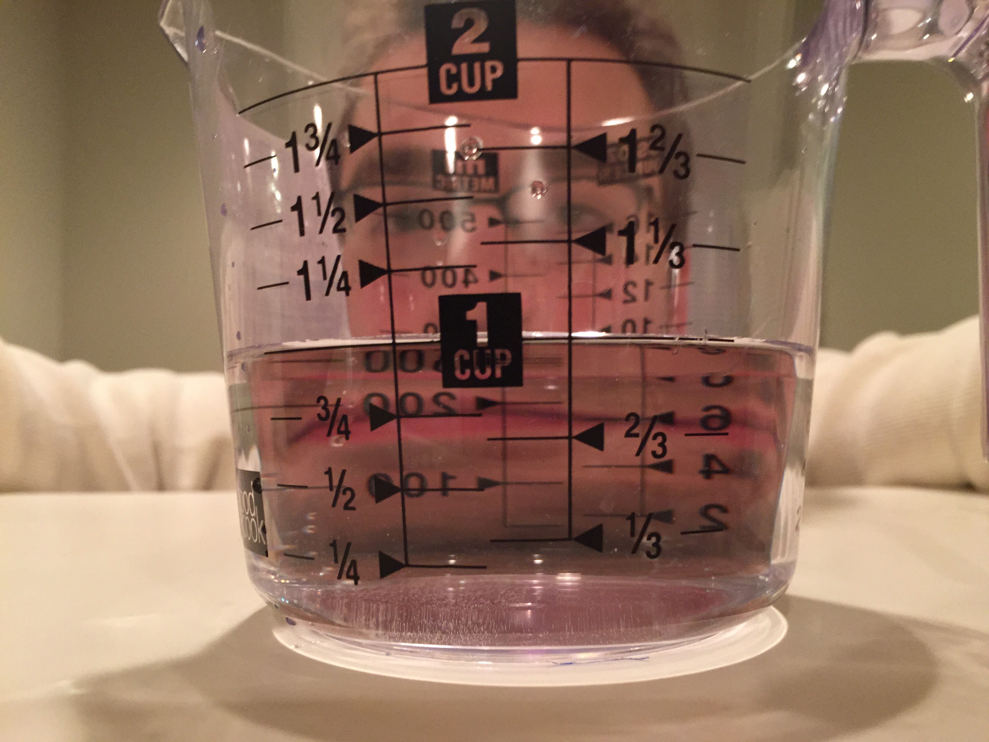 So I initially had this idea of taking a picture of myself through some water to distort the image in some way. I began with taking a picture of myself over rippled water, but I didn’t feel like it was telling enough. I decided to go with a “glass half full” of water and to photograph me from the other side (the only reason it’s a measuring cup is because I don’t have any clear cups). It is very plain in the background, keeping the subject of the photograph focused. The half full portion of the glass causes the lower half of my face to seem enormous, and the glasses shadow keeps a trapezoid-like shape around the bottom of the frame, due to the light source coming from above and behind me. I used similar tactics Duchamp used by using ordinary household items and photographing them in a subtly artistic way.