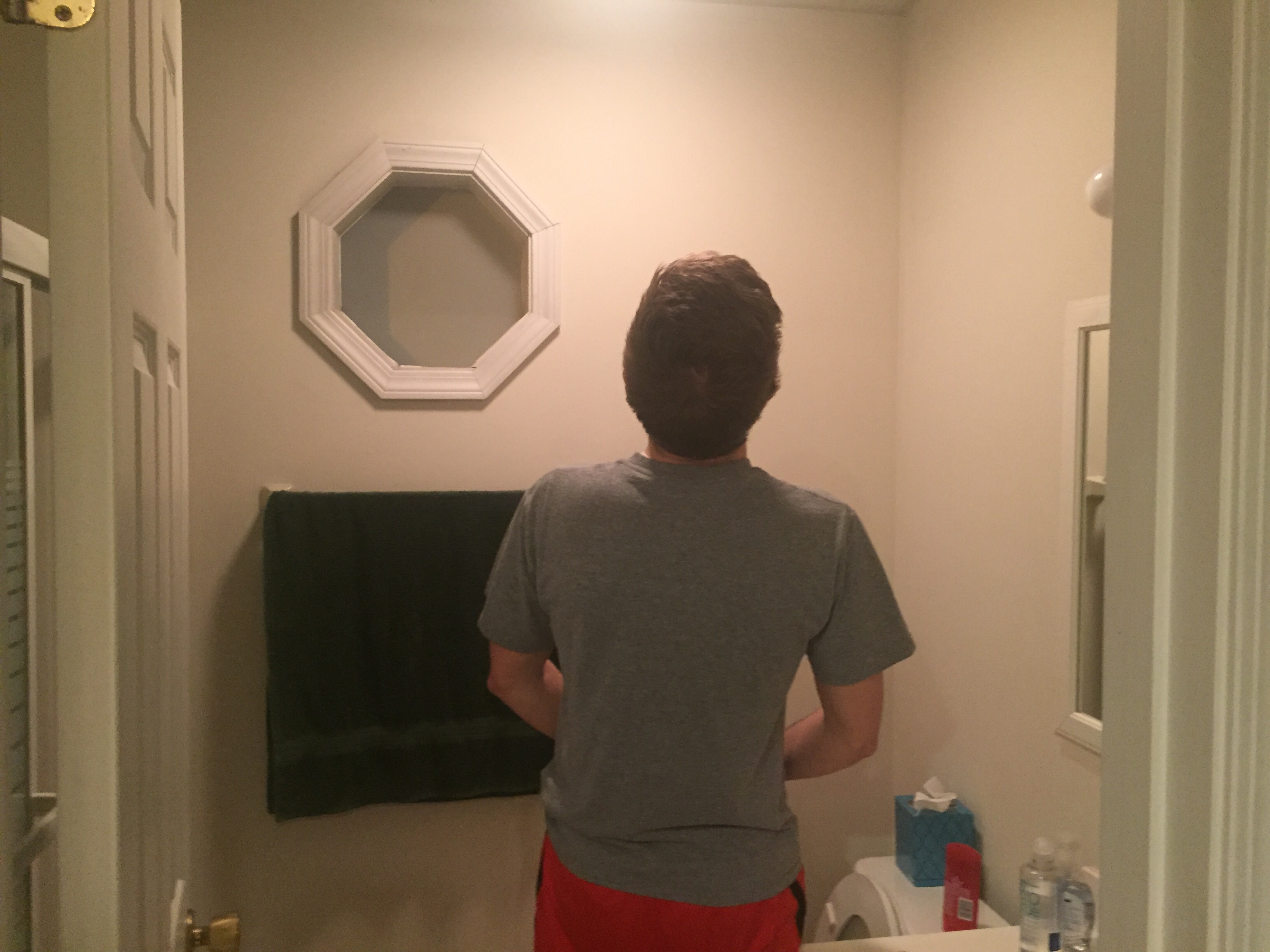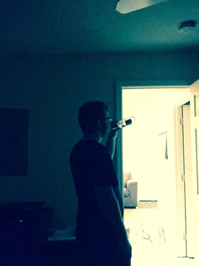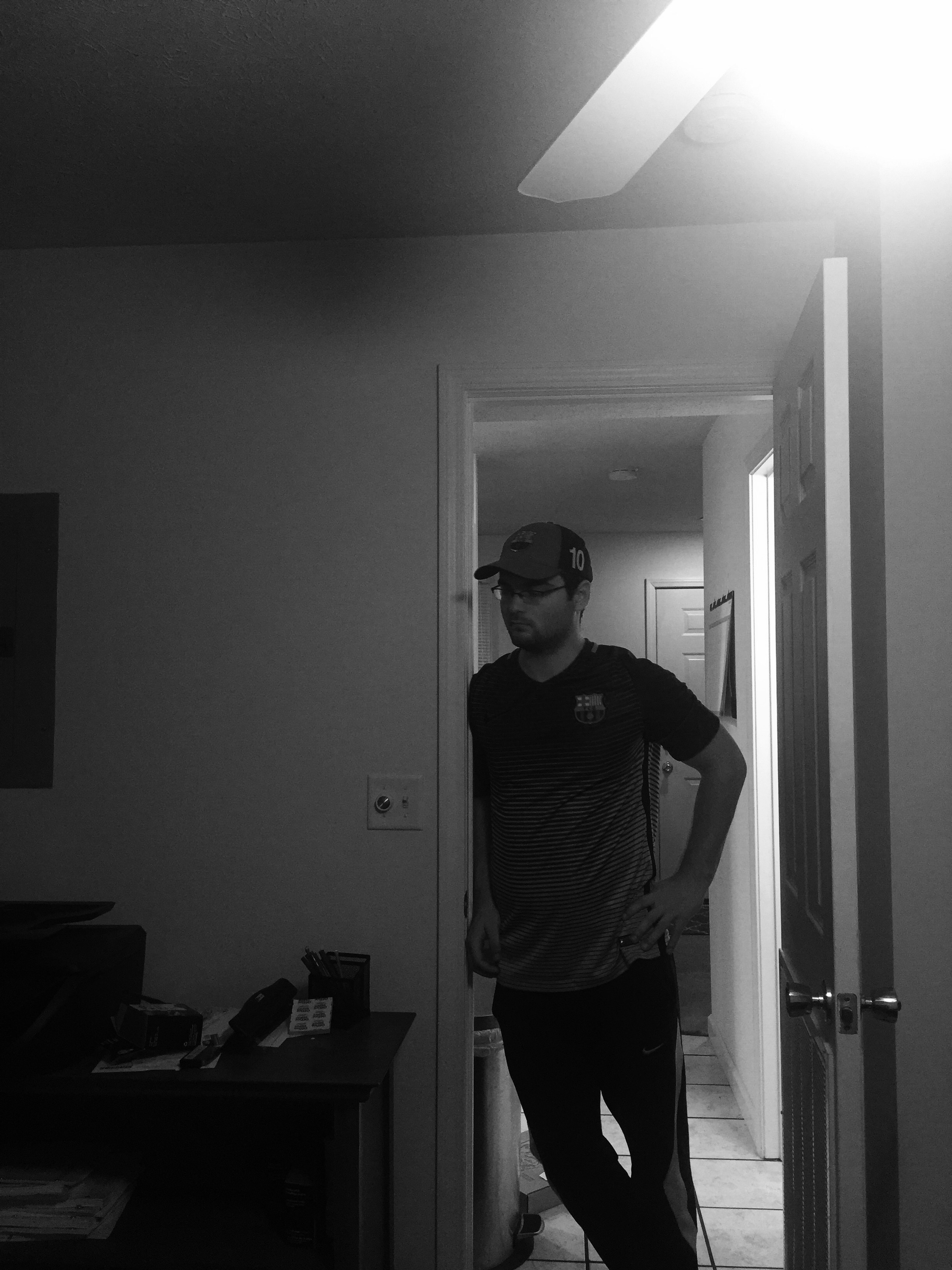 This is a medium long shot of me drinking the rest of my beer as I walk from my bedroom to my kitchen. The asymmetrical composition comes from the lighted doorway being paired with the darker me. I turned off the lights in my bedroom to experiment with the lighting that comes through my bedroom window every night, which thankfully makes most things in the photo more defined. However, I feel like another photo where maybe a little distance between me and the kitchen door would be better. And if I could do it just right, maybe the light from my bedroom window could reflect off of the beer bottle.