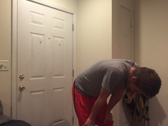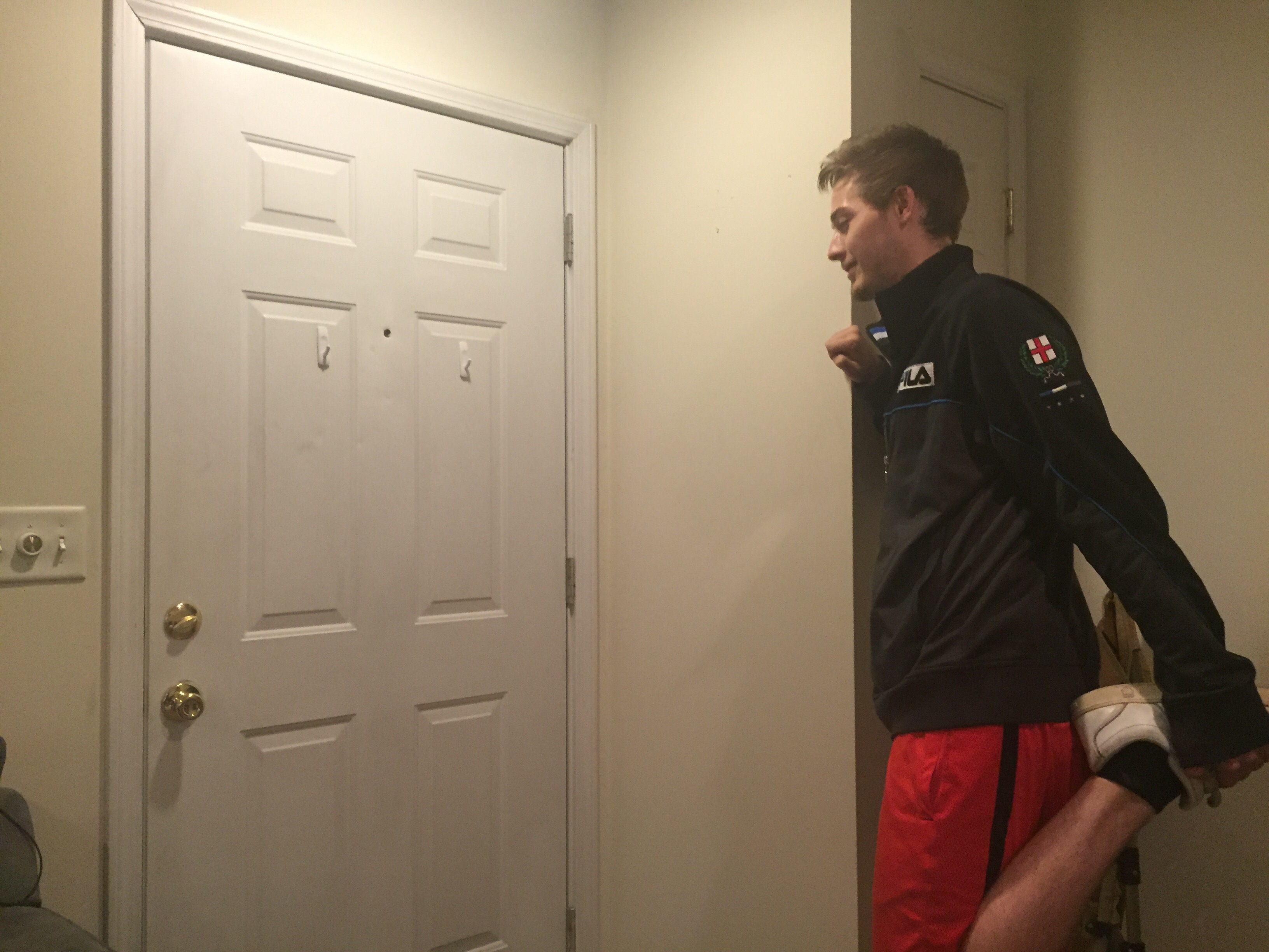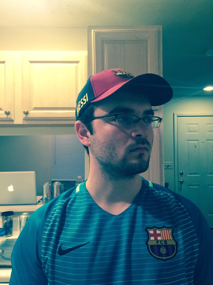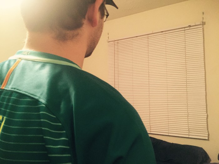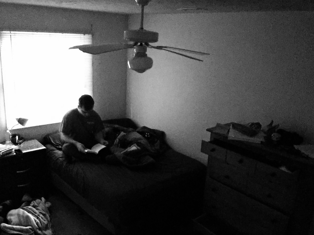 This is a medium long shot of me drinking the rest of my beer as I walk from my bedroom to my kitchen. The asymmetrical composition comes from the lighted doorway being paired with the darker me. I turned off the lights in my bedroom to experiment with the lighting that comes through my bedroom window every night, which thankfully makes most things in the photo more defined. However, I feel like another photo where maybe a little distance between me and the kitchen door would be better. And if I could do it just right, maybe the light from my bedroom window could reflect off of the beer bottle.