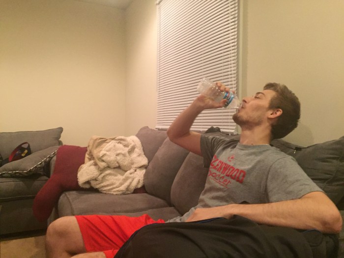For this linear series of photos I kept the idea of bringing the past back to the present rather primitive. For the fifth photos I needed to signify a time lapse of some sort other than the empty water bottle, and I didn’t want to use another filter on my phone so I tilted the photo and took a screenshot, giving it black space…I don’t really feel like it displays a time lapse well enough if at all though. Of course, the fifth shot shows the man realizing his bladder is telling him something, and the sixth ends the cycle.